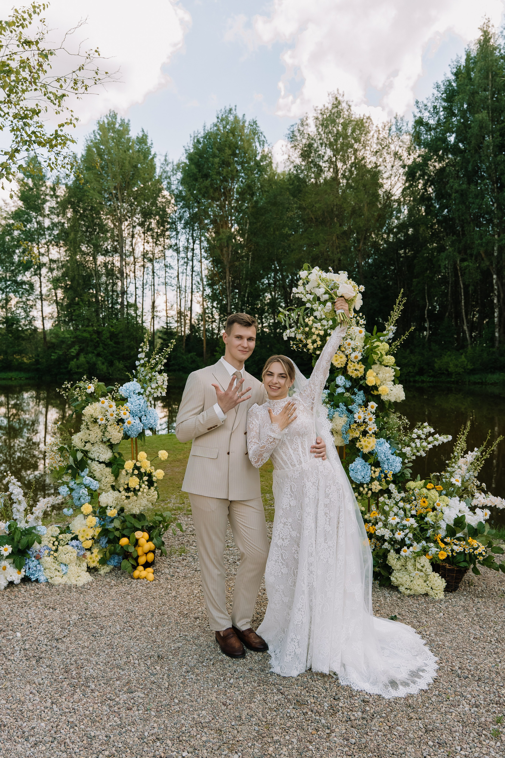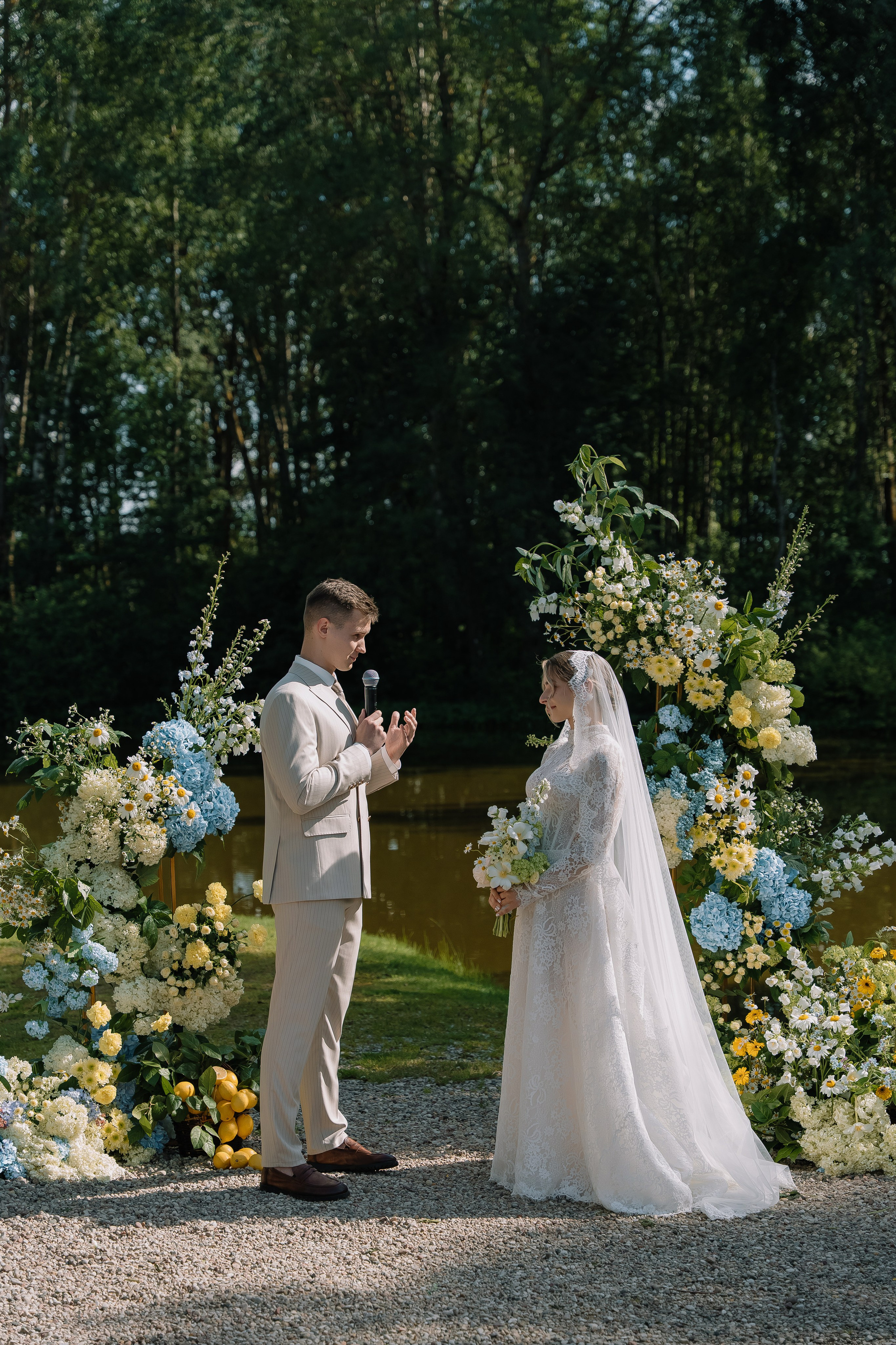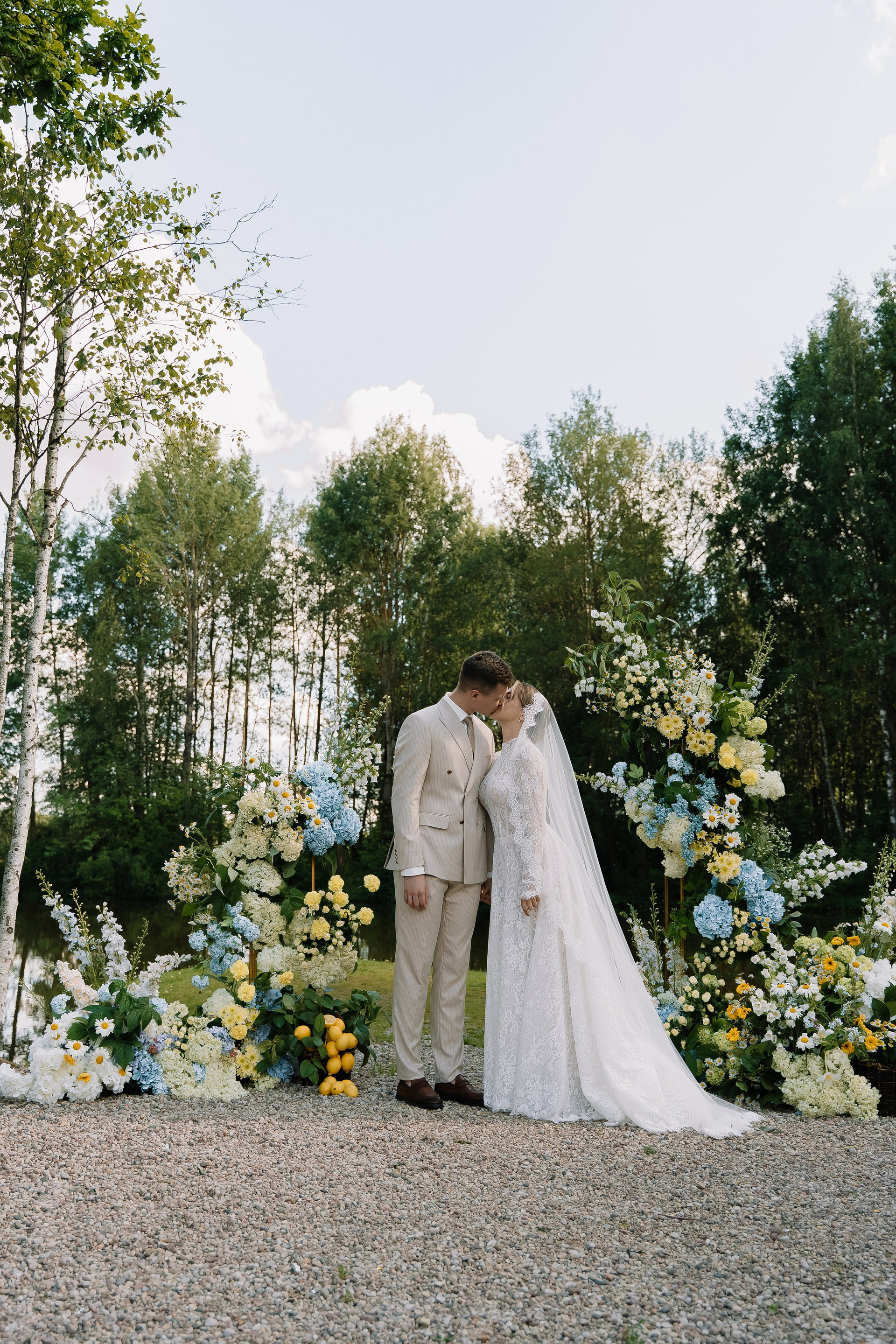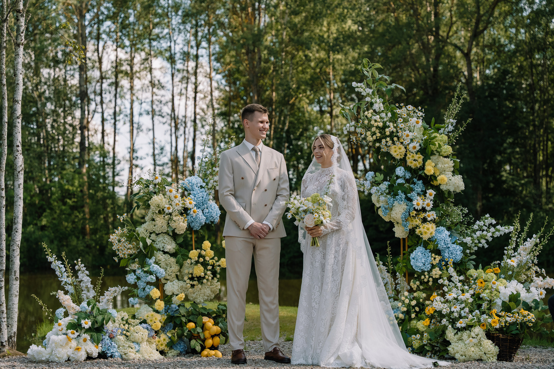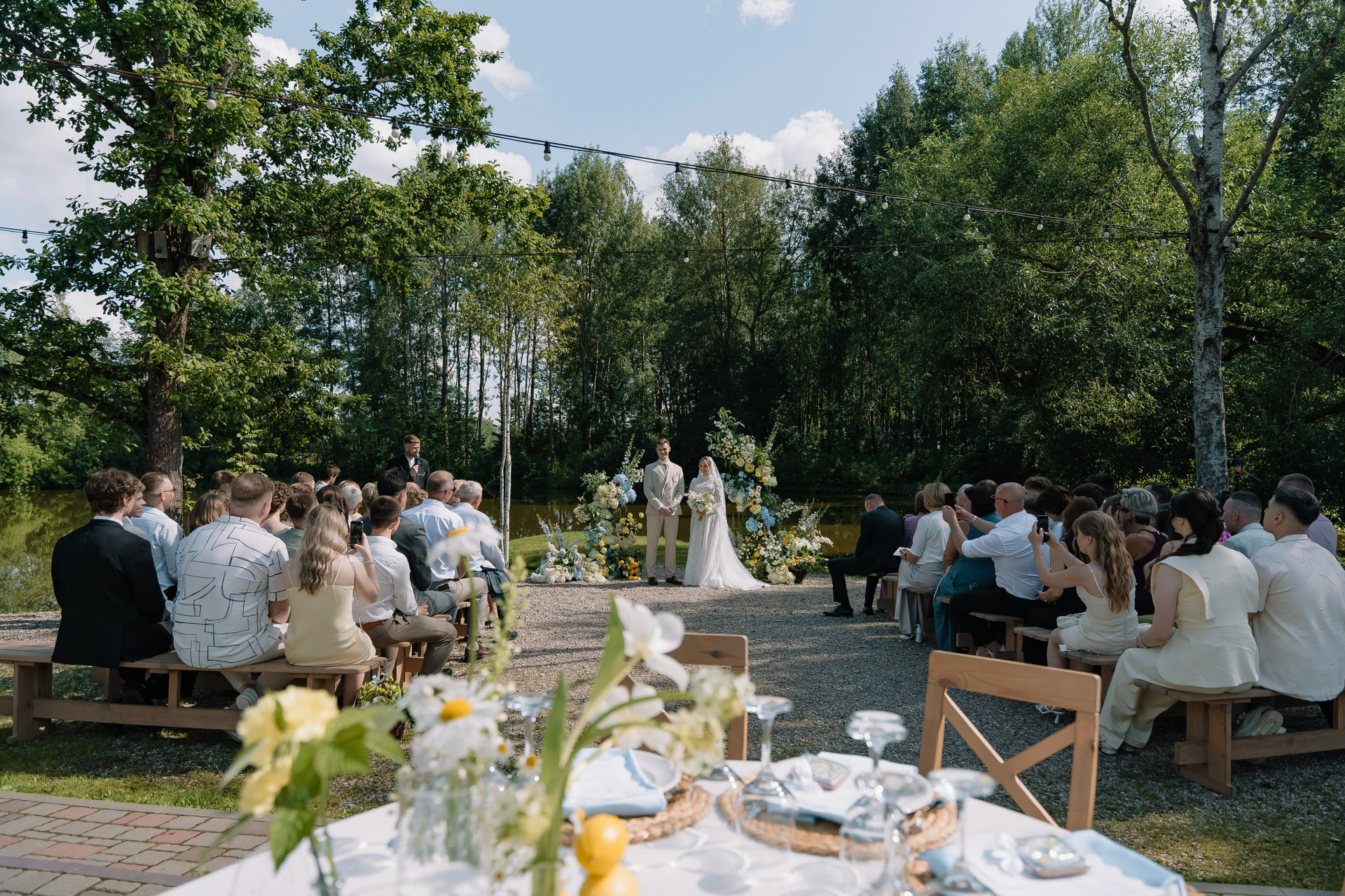 Свадьба под открытым небом в середине июля — это всегда одновременно романтично и рискованно. Перед торжеством пара переживали за погоду: неоднократно обсуждали сценарии на случай дождя или сильной жары. Однако, всё сложилось идеально.
