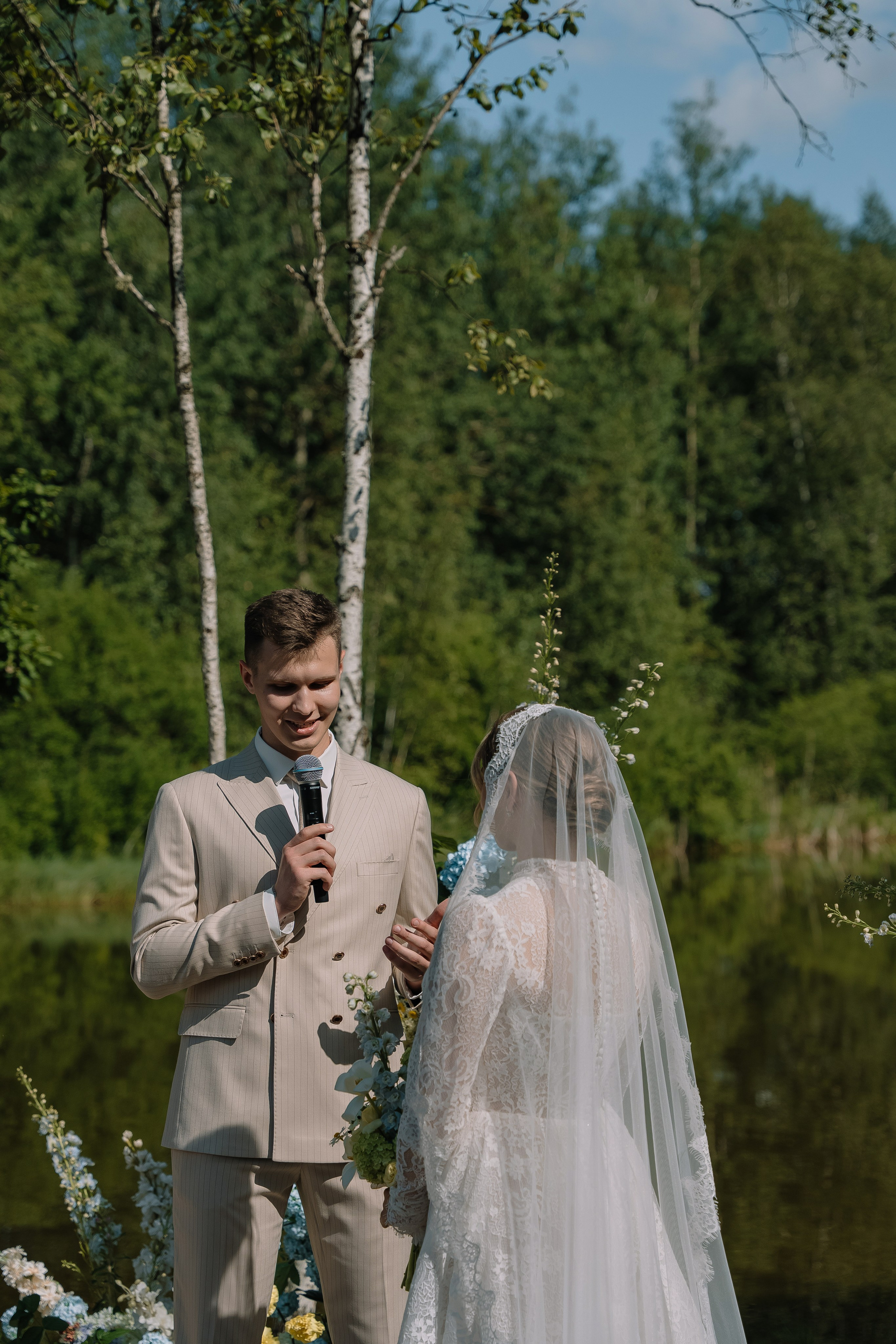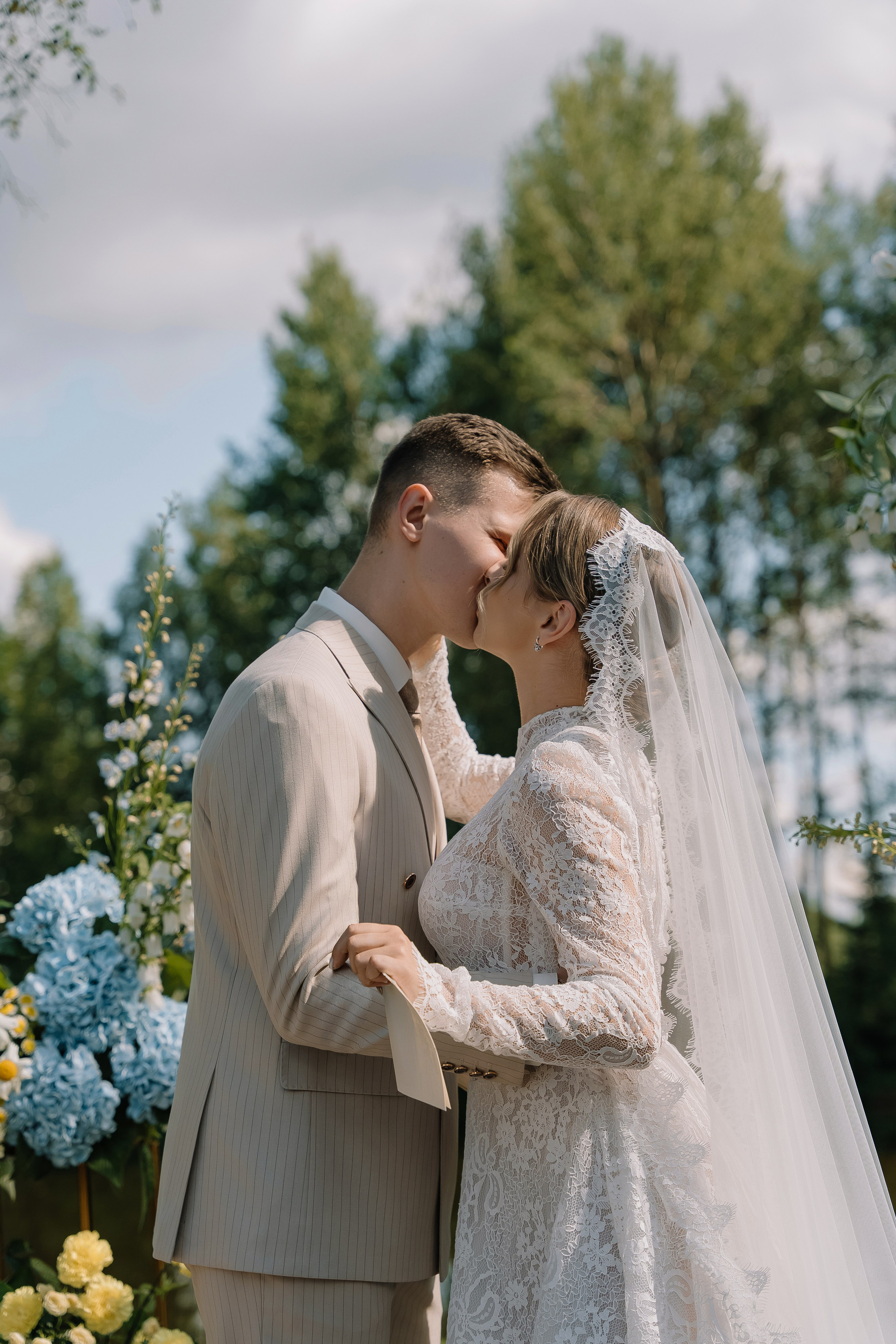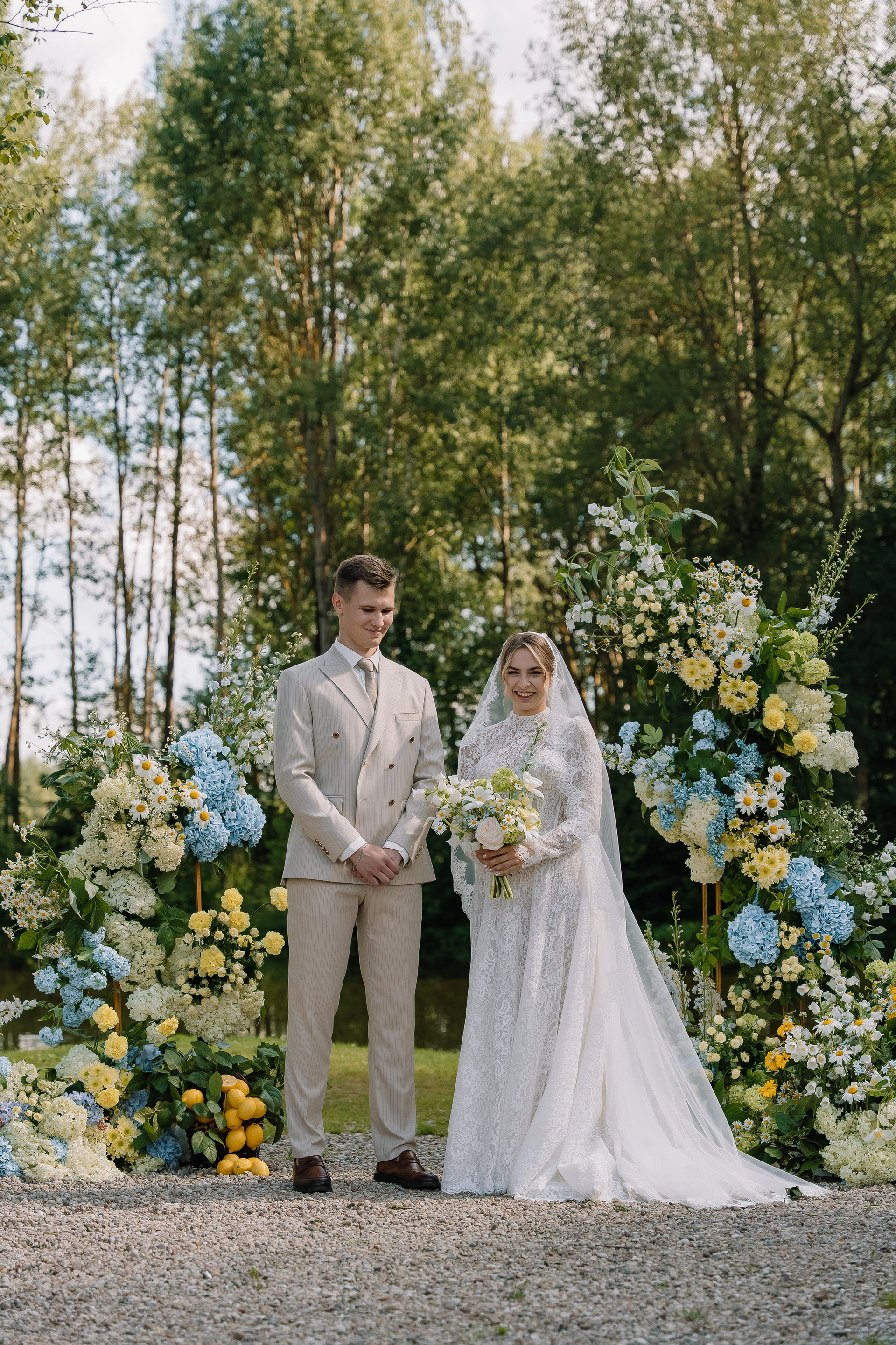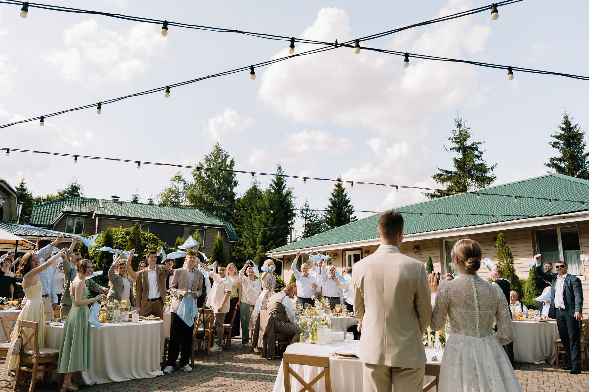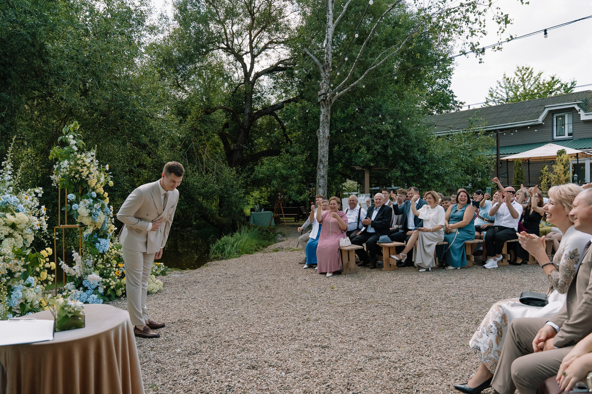Свадьба под открытым небом в середине июля — это всегда одновременно романтично и рискованно. Перед торжеством пара переживали за погоду: неоднократно обсуждали сценарии на случай дождя или сильной жары. Однако, всё сложилось идеально.