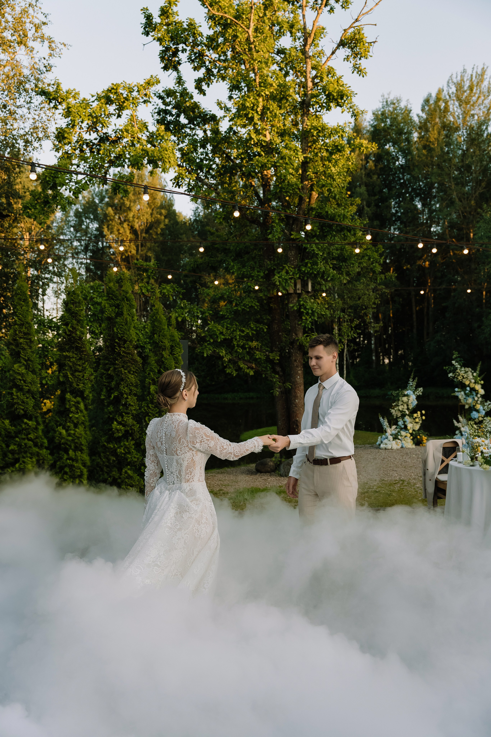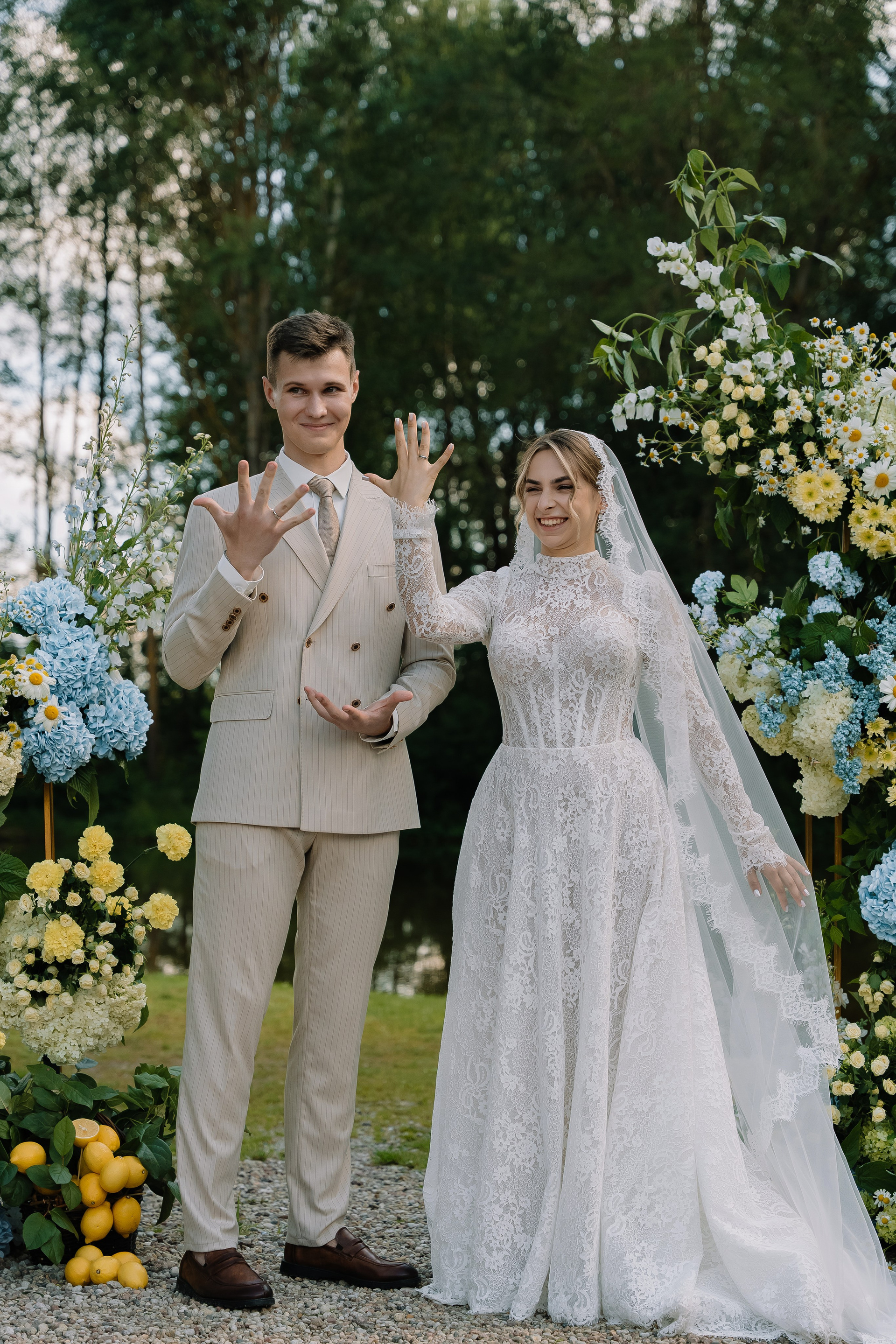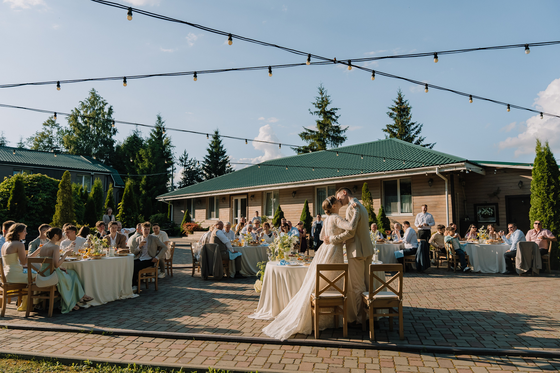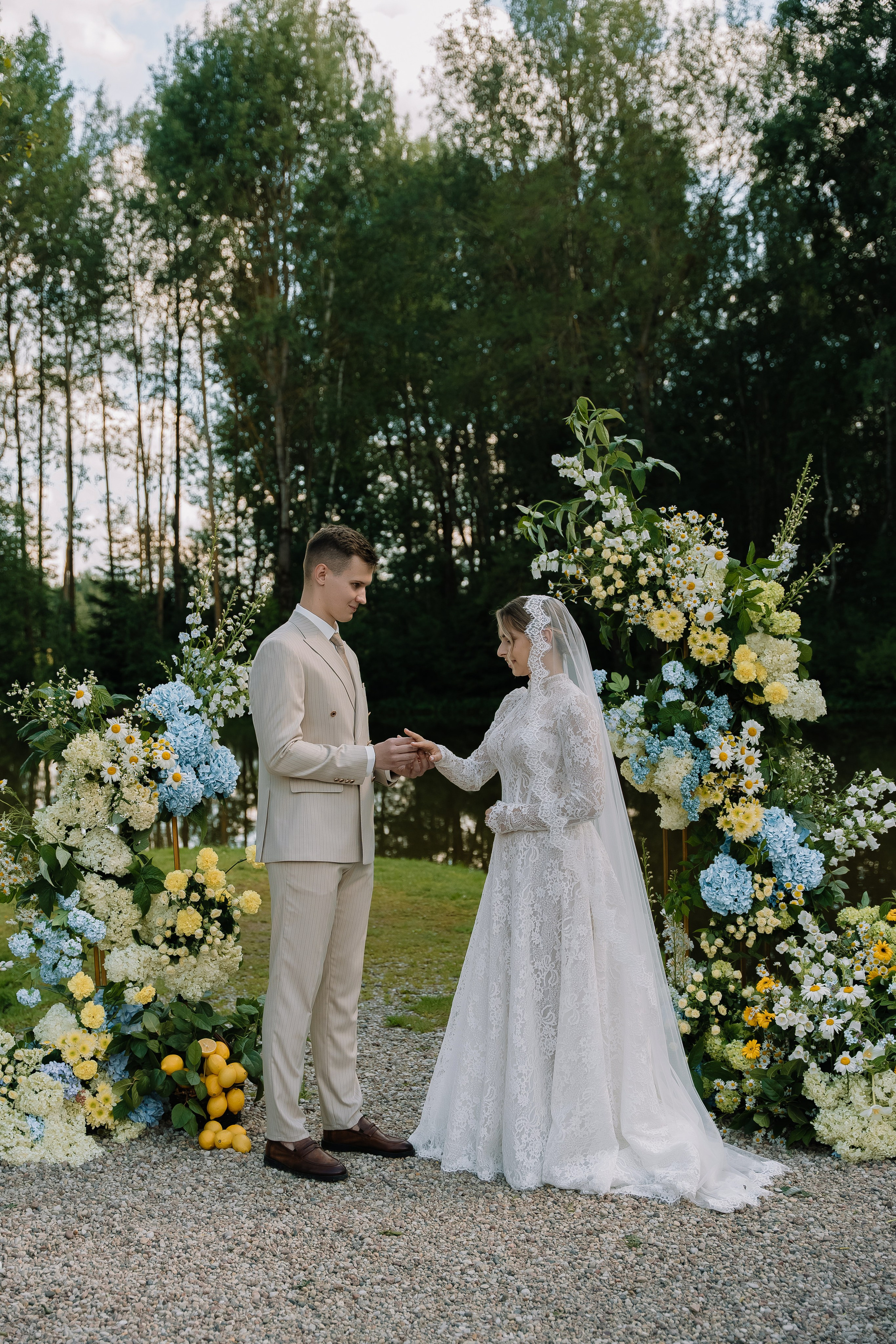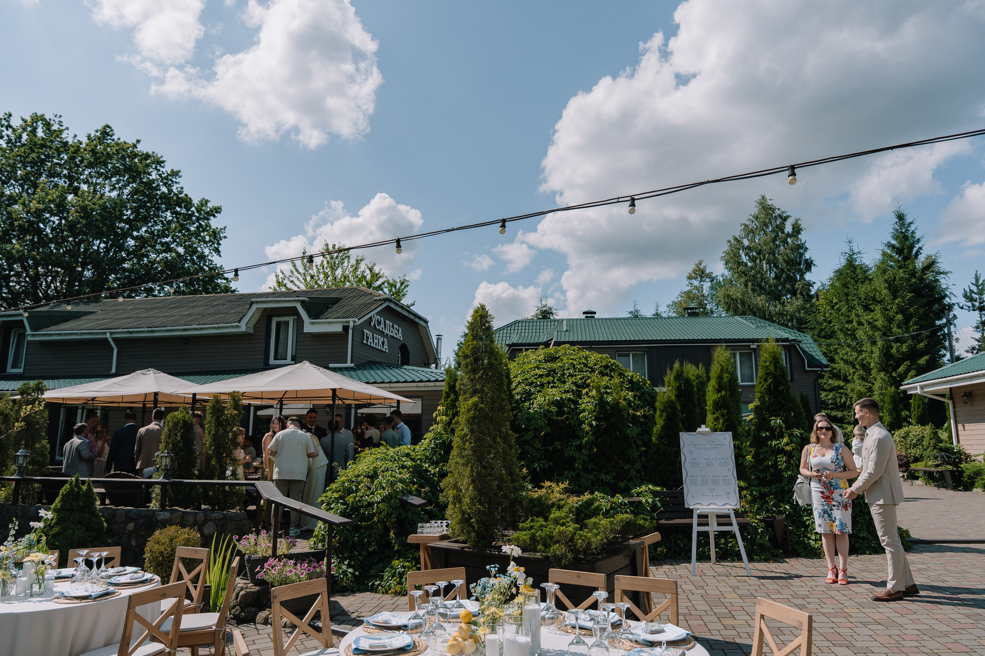 Свадьба под открытым небом в середине июля — это всегда одновременно романтично и рискованно. Перед торжеством пара переживали за погоду: неоднократно обсуждали сценарии на случай дождя или сильной жары. Однако, всё сложилось идеально.