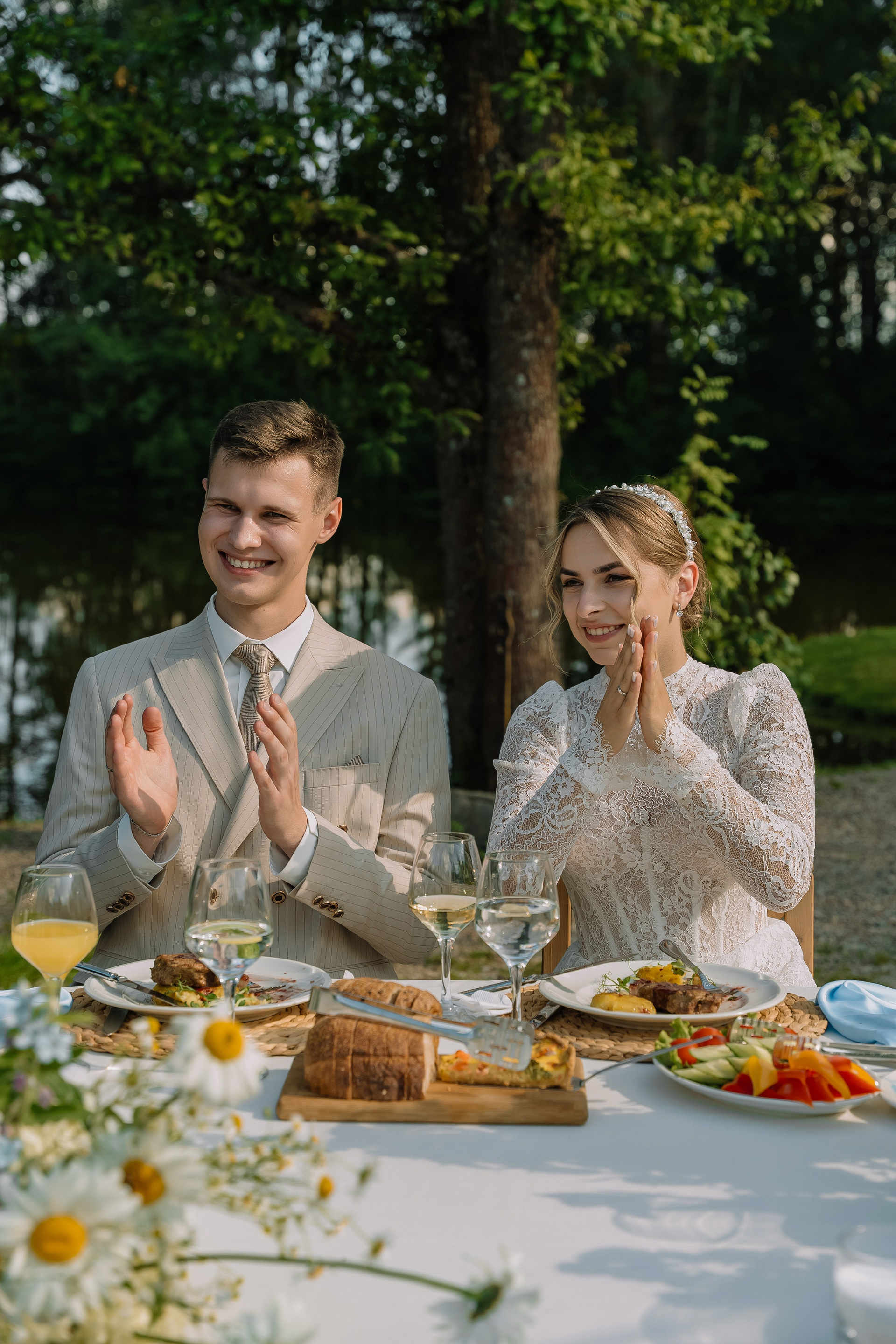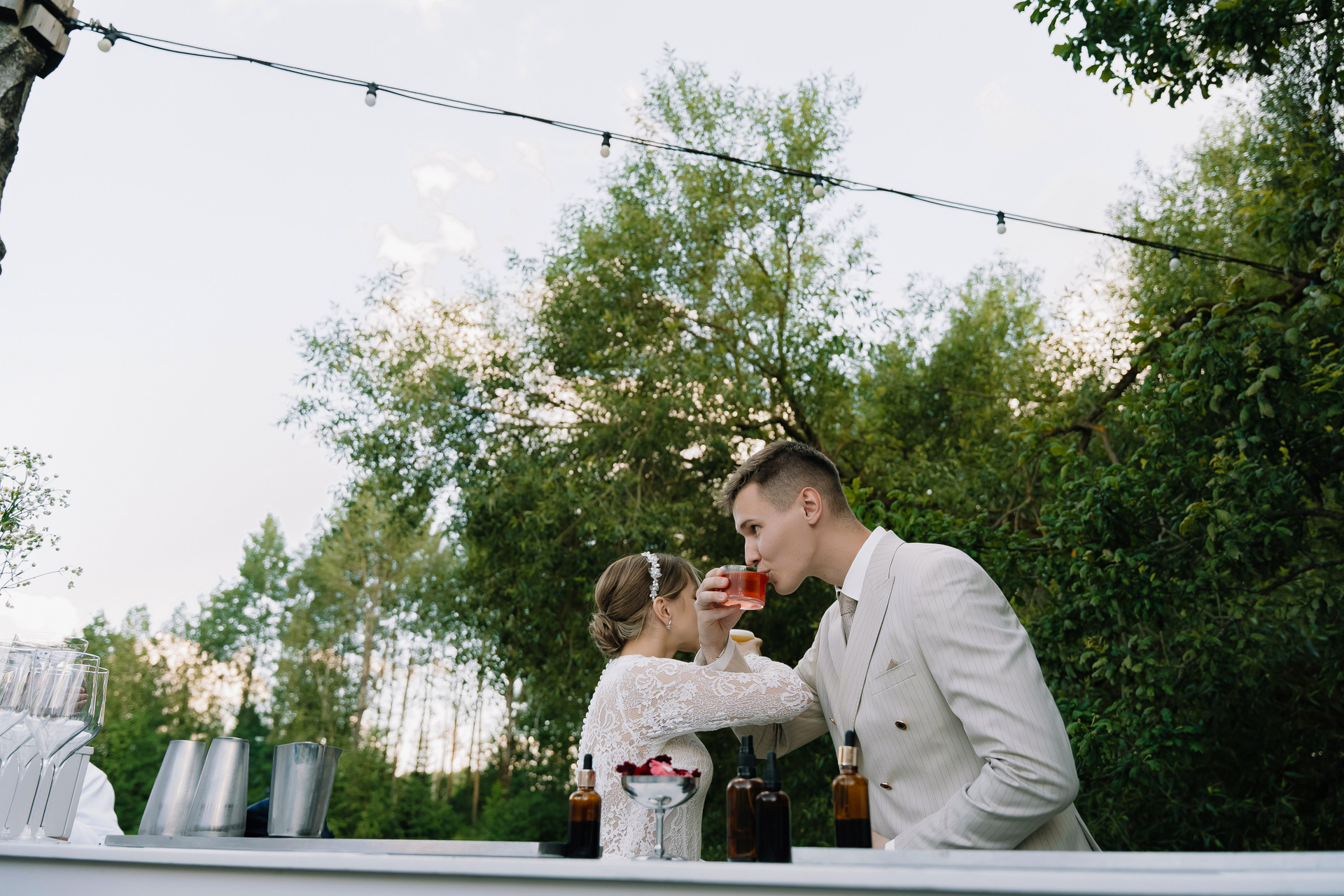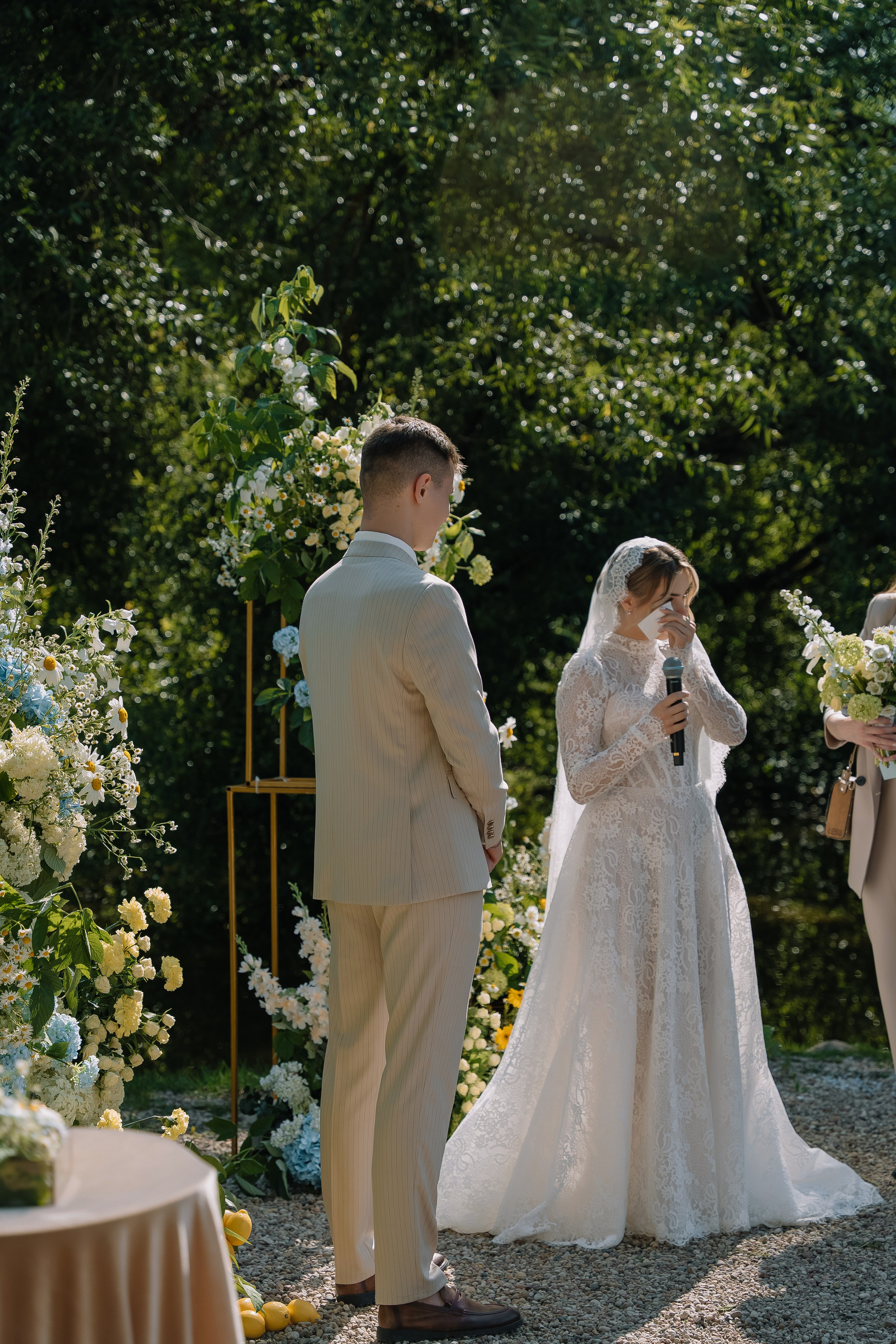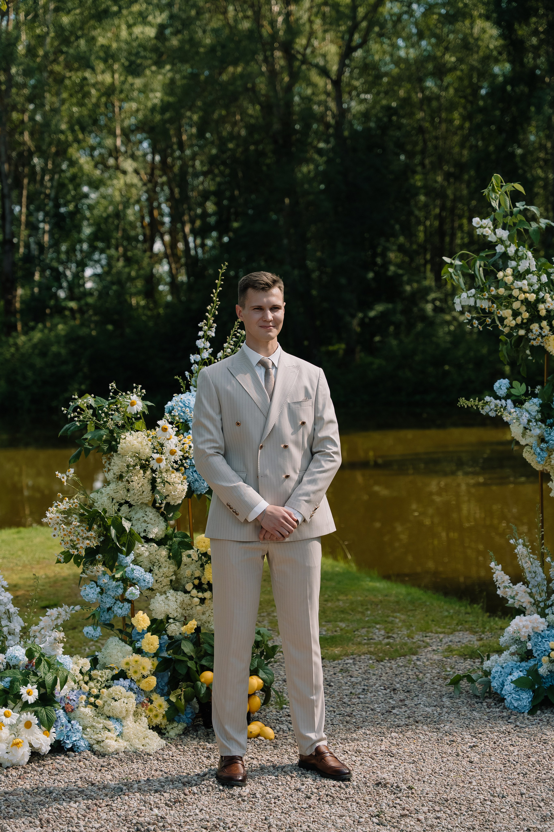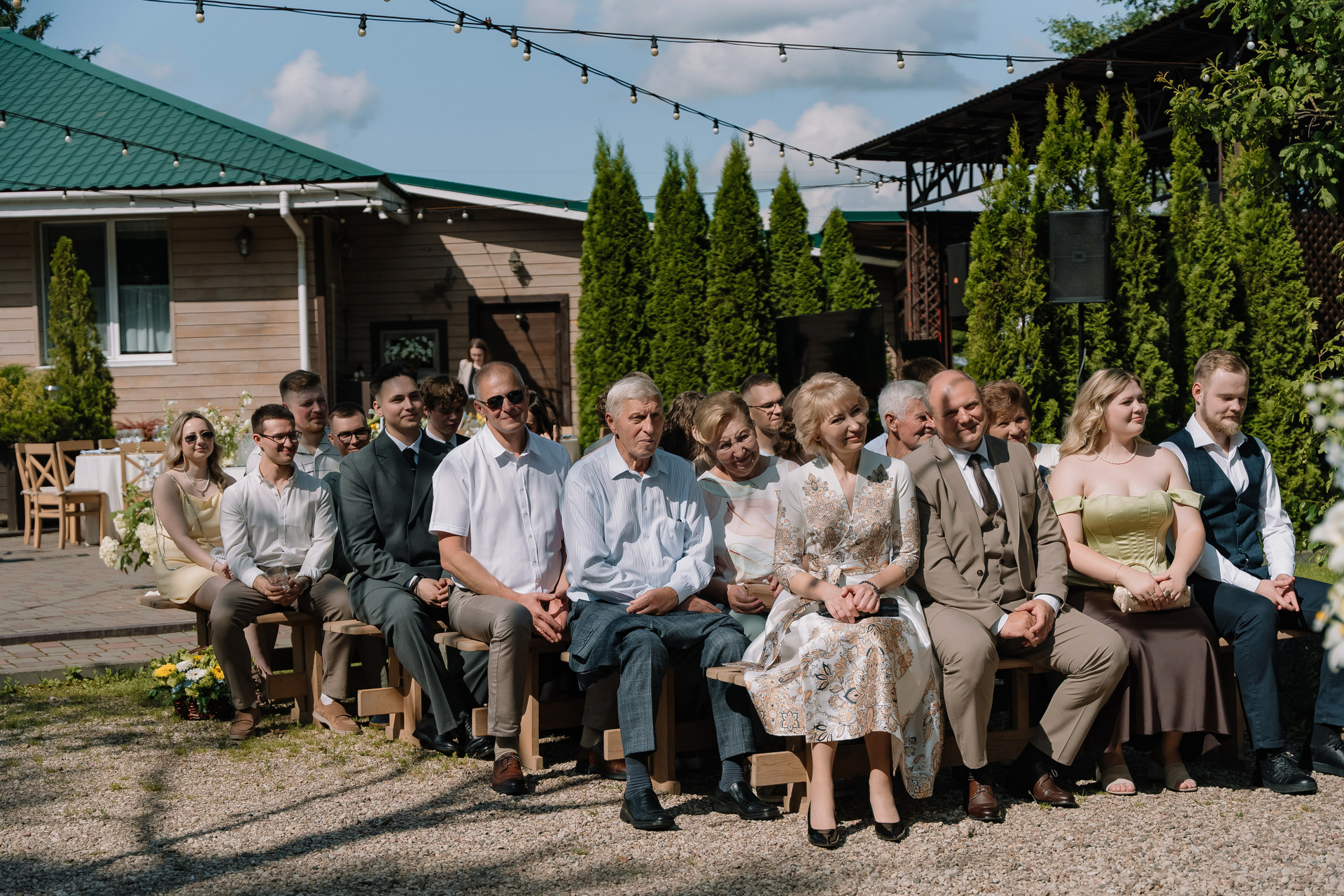 Свадьба под открытым небом в середине июля — это всегда одновременно романтично и рискованно. Перед торжеством пара переживали за погоду: неоднократно обсуждали сценарии на случай дождя или сильной жары. Однако, всё сложилось идеально.