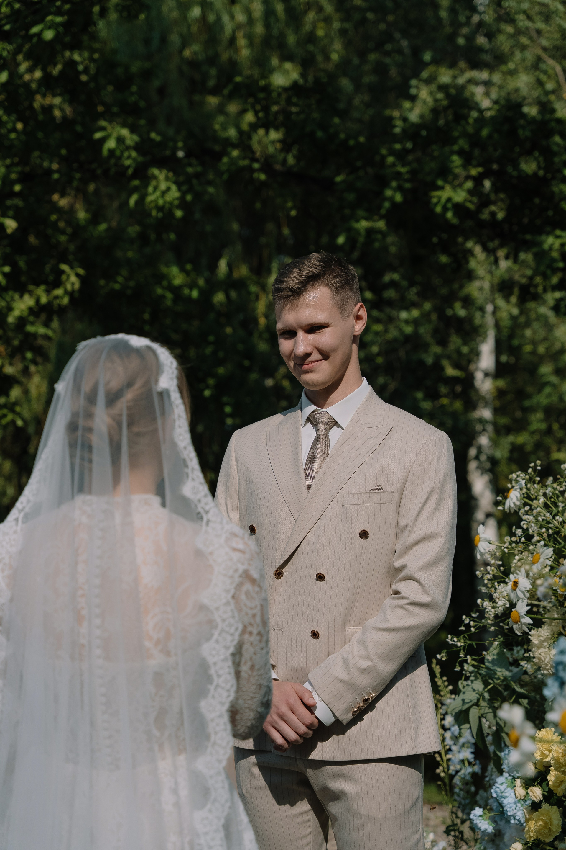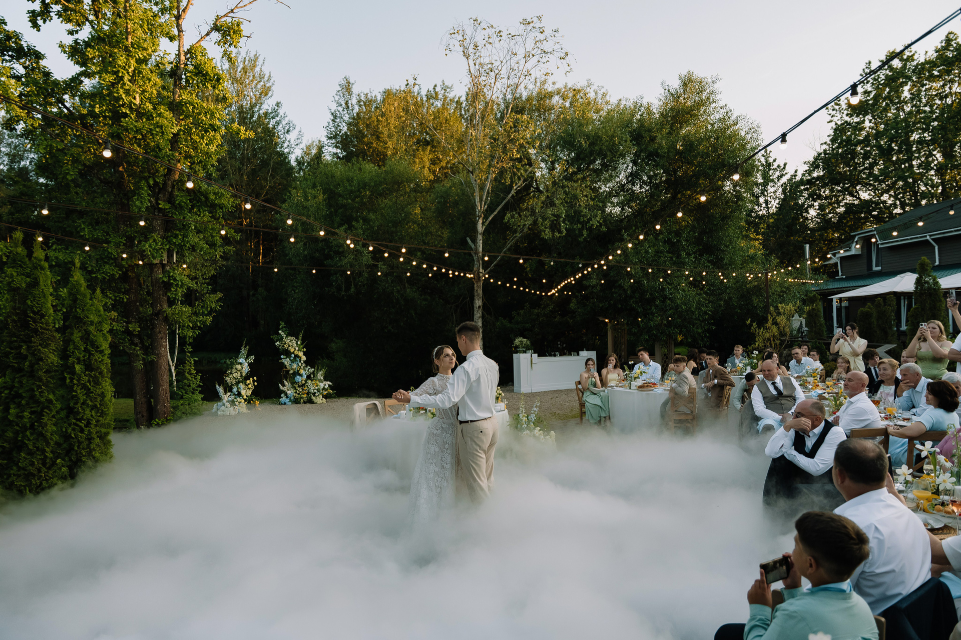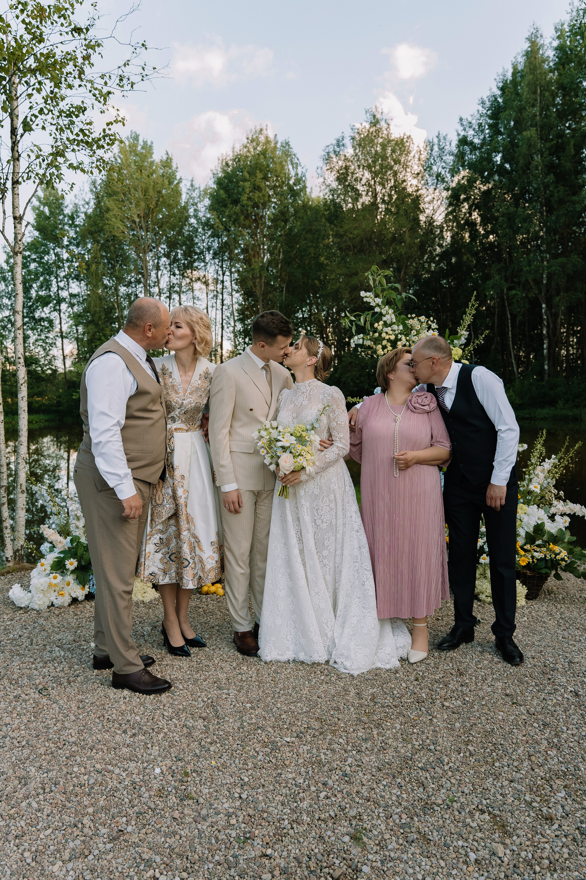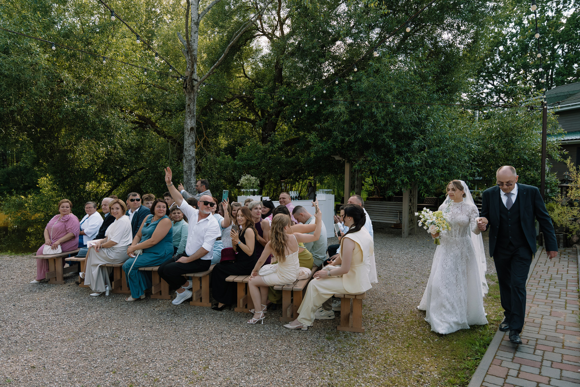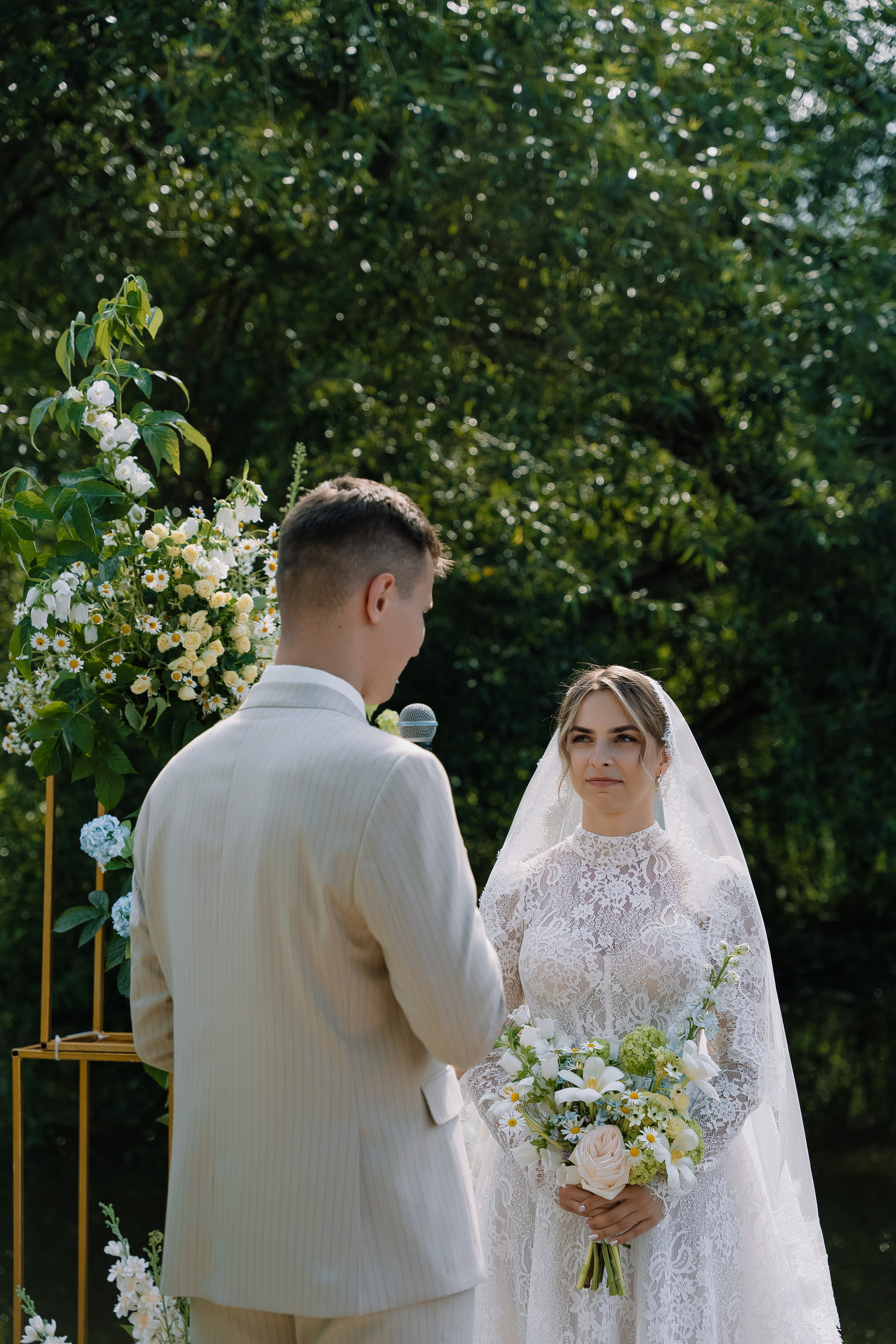 Свадьба под открытым небом в середине июля — это всегда одновременно романтично и рискованно. Перед торжеством пара переживали за погоду: неоднократно обсуждали сценарии на случай дождя или сильной жары. Однако, всё сложилось идеально.