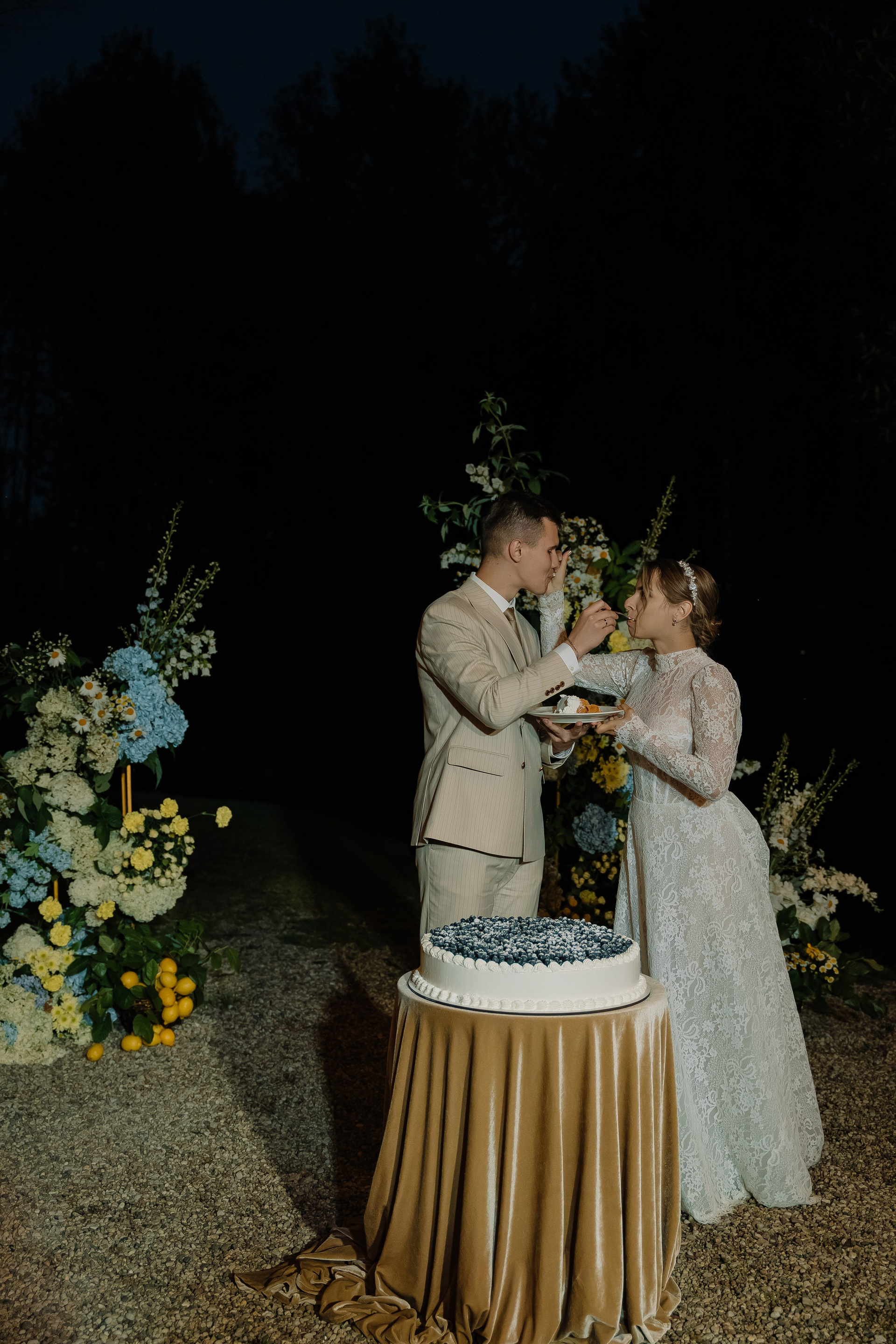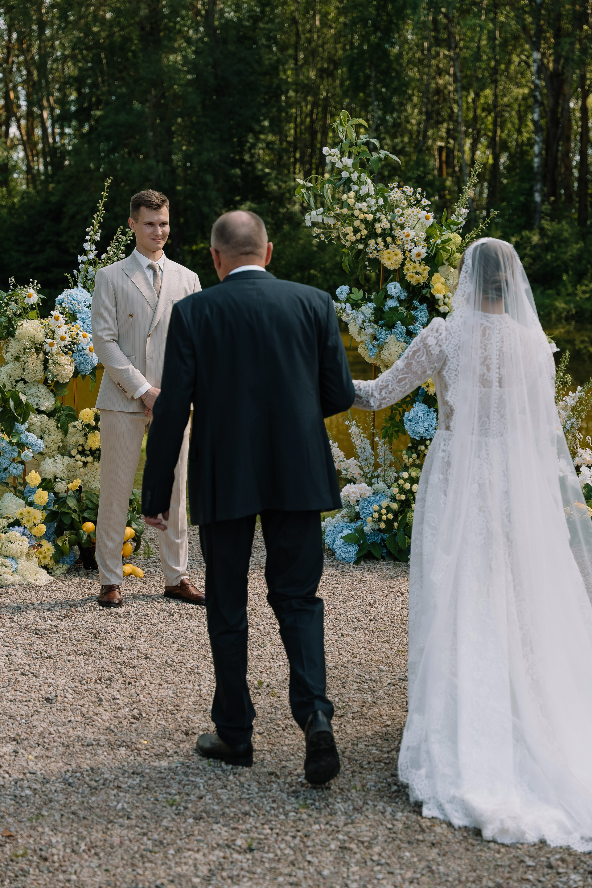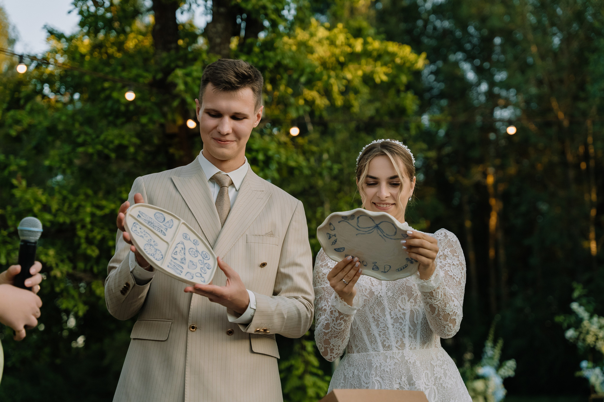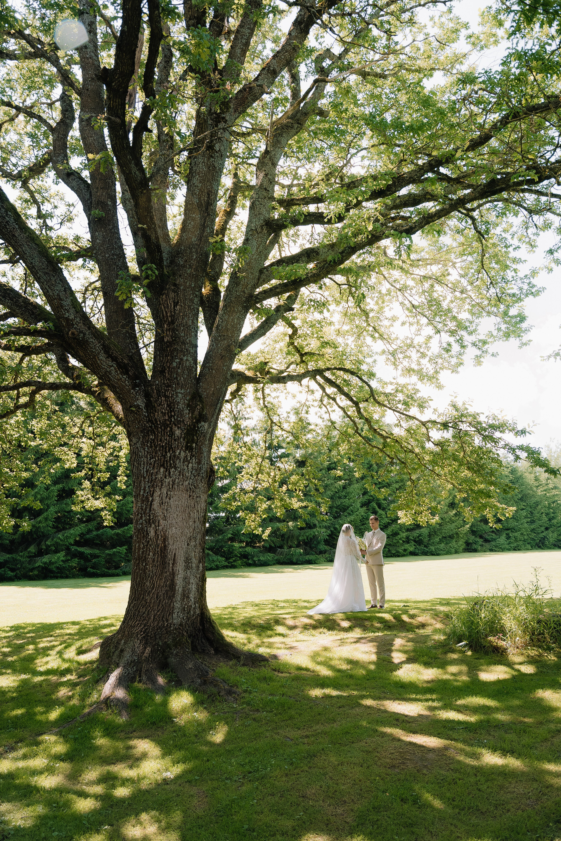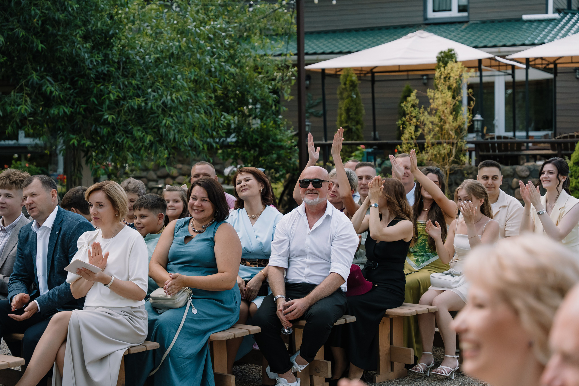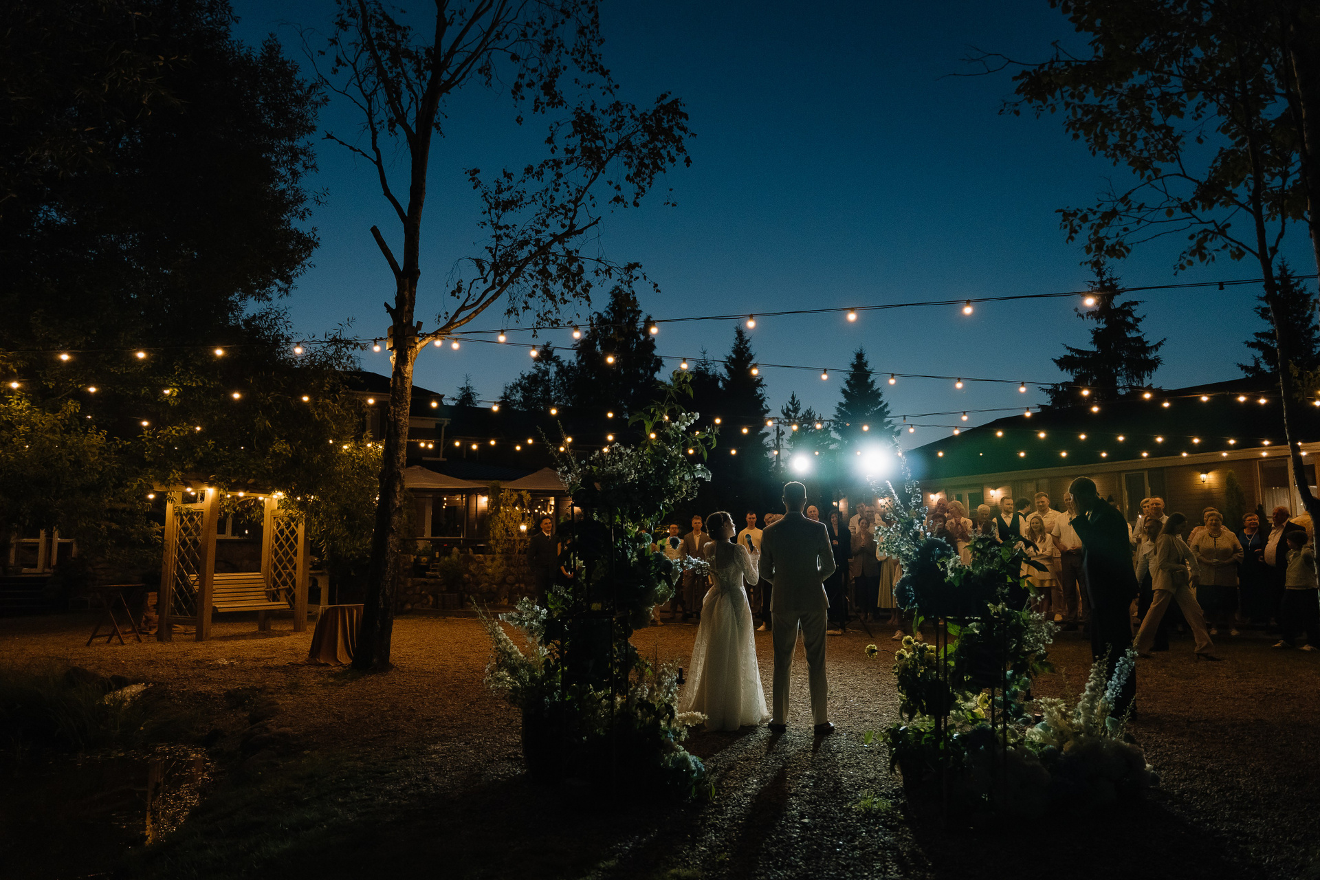 Свадьба под открытым небом в середине июля — это всегда одновременно романтично и рискованно. Перед торжеством пара переживали за погоду: неоднократно обсуждали сценарии на случай дождя или сильной жары. Однако, всё сложилось идеально.